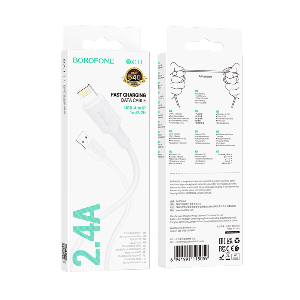The Borofone BX111 Feliz is a high-quality charging and data cable made for daily use. With a smooth PVC jacket and reinforced joints, it ensures durability and flexibility. Its 1-meter length makes it convenient for home, office, or travel use. Built with a strong wire core design, it delivers stable data transfer and supports fast charging up to 2.4A, making it the perfect choice for Apple device users.