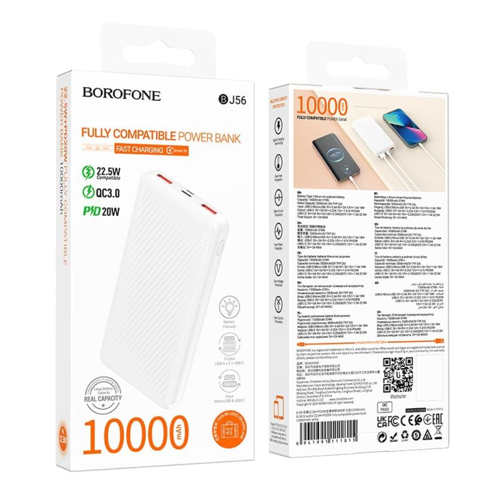 باور بنك أنيق من Borofone موديل BJ56 بسعة 10000mAh، يدعم الشحن السريع بقوة 22.5W مع بروتوكول PD20W ليمنحك شحن فائق السرعة وآمن لأجهزتك الذكية.