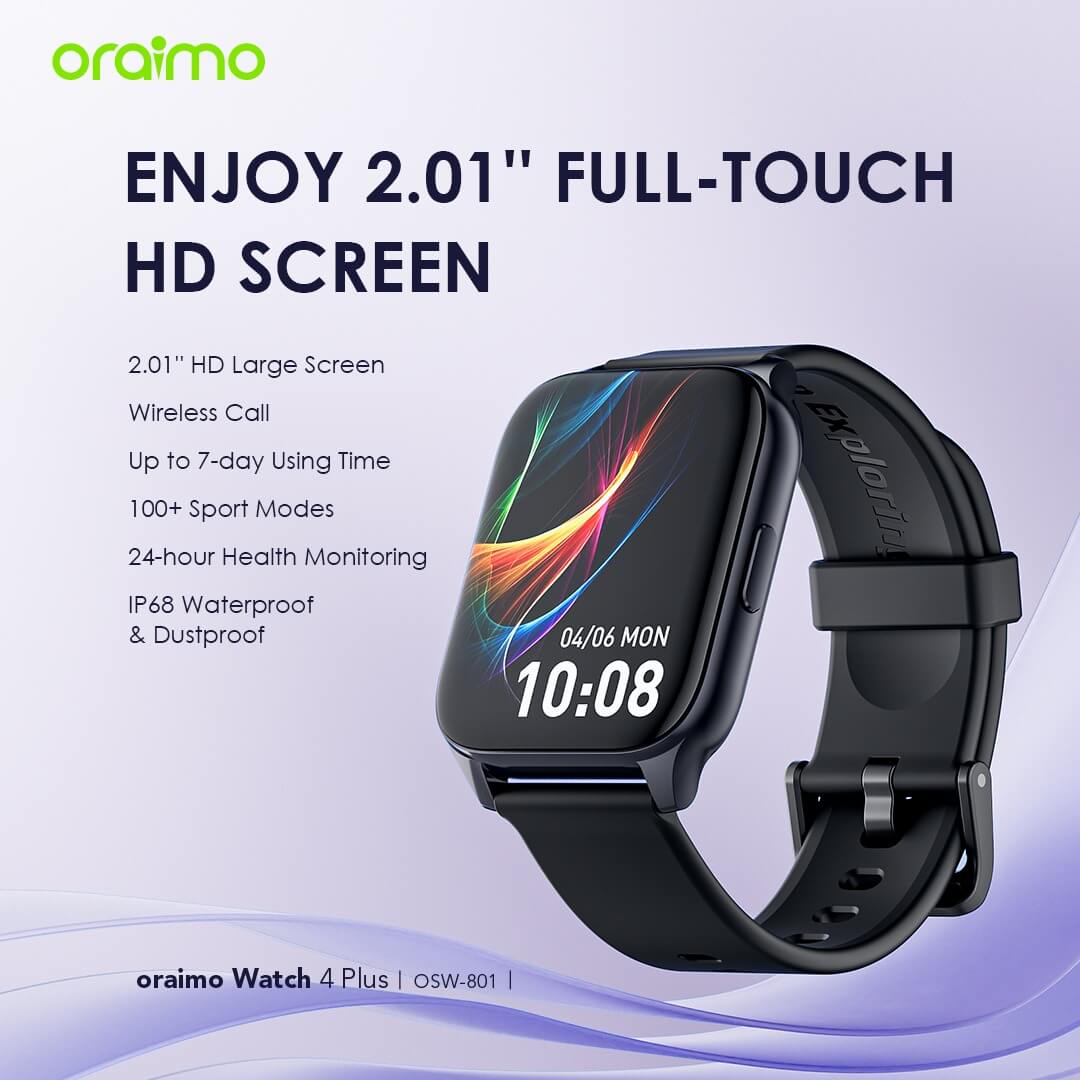 ساعة Oraimo Watch 4 Plus (OSW-801) تجمع بين التصميم العصري والأداء العملي، مع شاشة كبيرة 2.01 إنش HD لعرض أوضح وأكثر راحة.